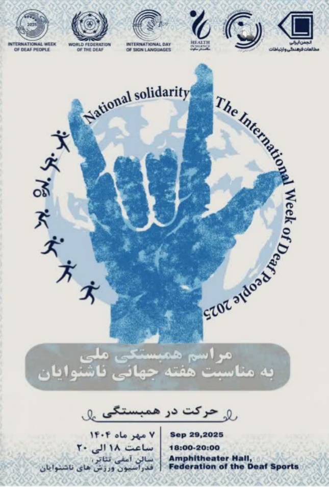 به گزارش روابط عمومی فدراسیون ورزشهای ناشنوایان؛ مراسم همبستگی ملی به مناسبت هفته جهانی ناشنوایان با عنوان حرکت در همبستگی با همکاری انجمن مطالعات اجتماعی، روز دوشنبه ۷ مهرماه از ساعت ۱۸ تا ۲۰ در سالن آمفیتئاتر فدراسیون برگزار میشود.